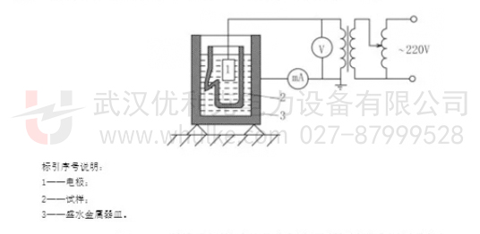 輔助型絕緣手套:將輔助型絕緣手套浸入盛有自來水的金屬器皿中,保持手套內(nèi)外水平面高度相同,套口邊緣露出水面 90mm±13mm 并擦干,逐漸升壓至表 27 規(guī)定值,保持規(guī)定時(shí)間,并測(cè)量泄漏電流,試驗(yàn)接線見下圖。