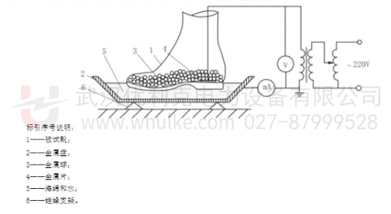 輔助型絕緣靴:外觀應(yīng)完好無損,鞋幫不應(yīng)開膠,鞋底防滑齒不應(yīng)磨平、外底不應(yīng)磨透露出絕緣層等。試驗(yàn)應(yīng)無擊穿、閃絡(luò)現(xiàn)象,且泄漏電流不超過規(guī)定值,按 GB 21148 的規(guī)定進(jìn)行,試驗(yàn)接線見下圖 。